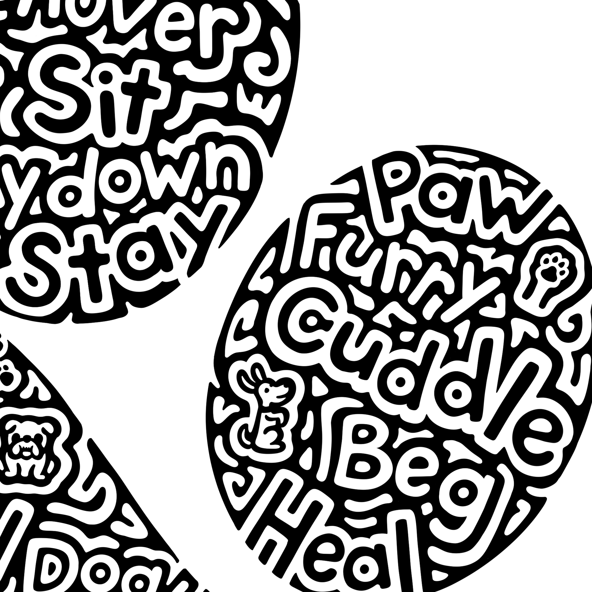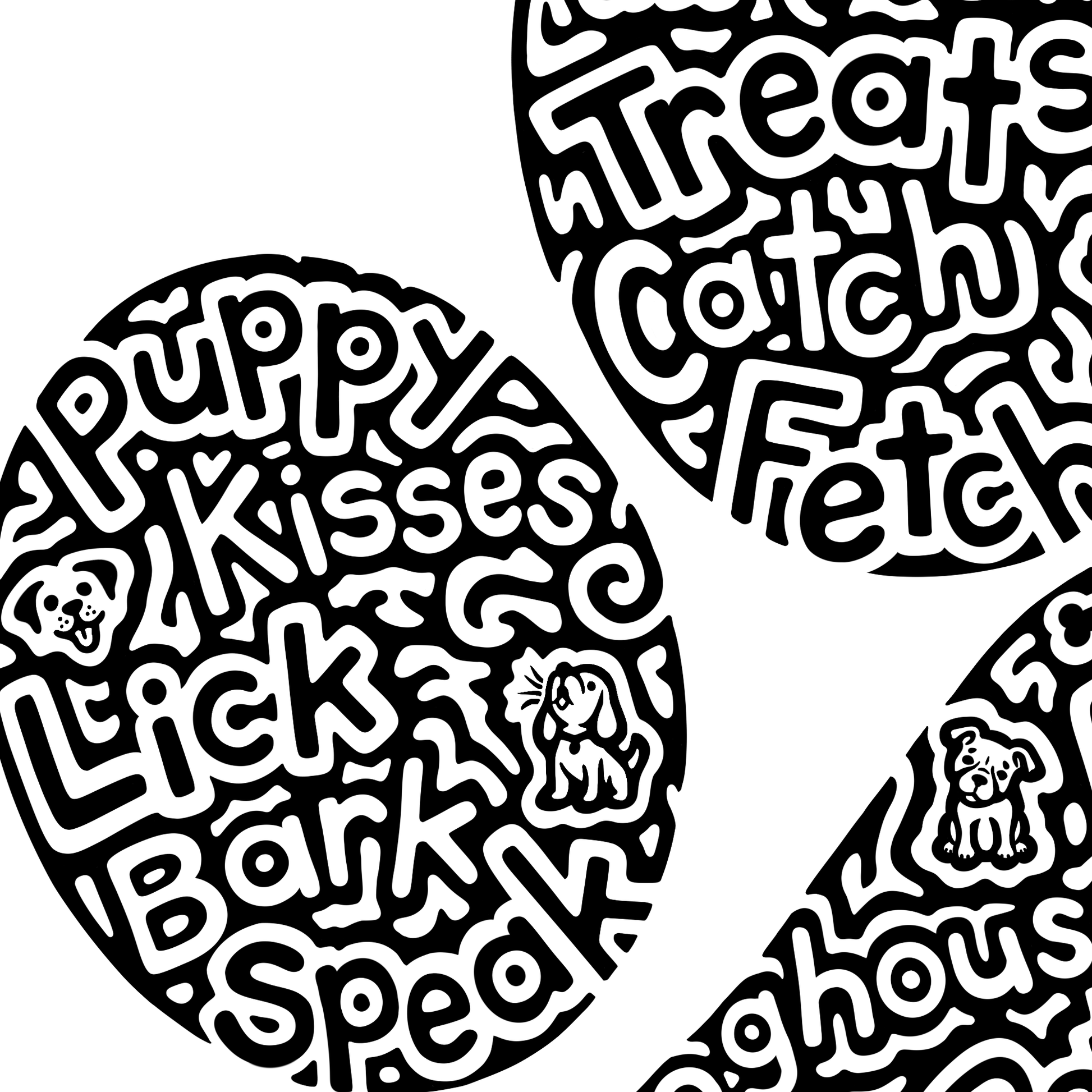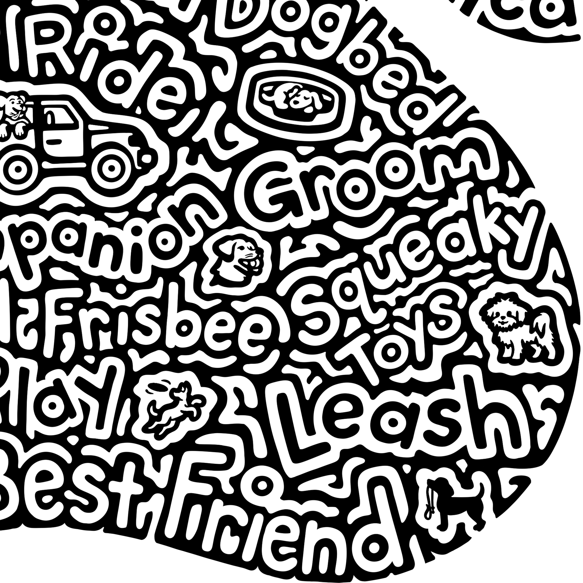 Words inside- puppy, kisses, lick, bark, speak, dog, walk, treats, catch, fetch, canine, rollover, sit, laydown, stay, paw, furry, cuddle, beg, heal, bone, doghouse, loyal, dog bed, pet, ride, kong, companion, groom, rawhide, ball, frisbee, squeaky toys, collar, play, leash, man's best friend