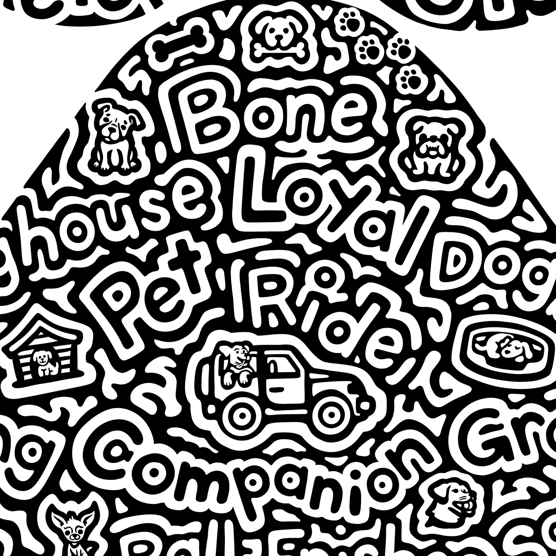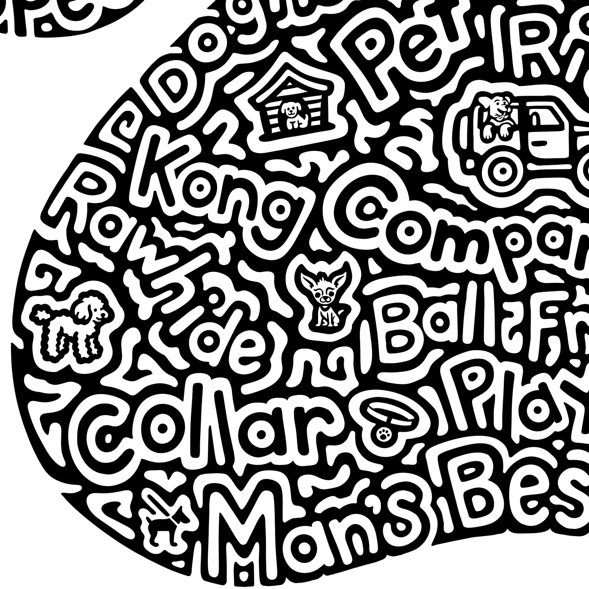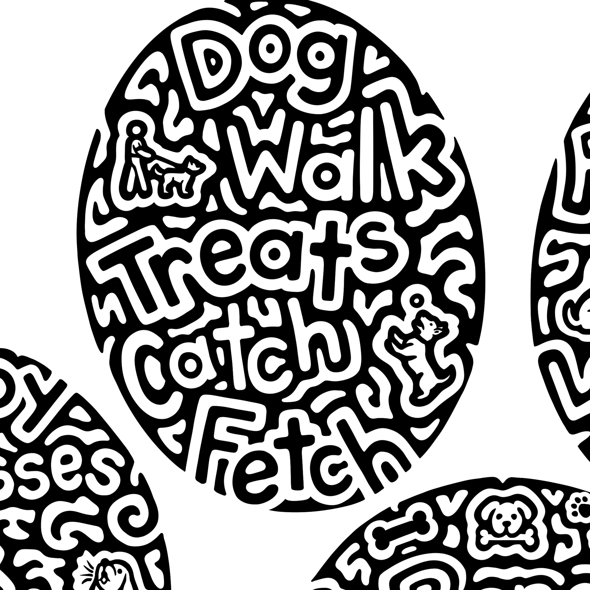 Words inside- puppy, kisses, lick, bark, speak, dog, walk, treats, catch, fetch, canine, rollover, sit, laydown, stay, paw, furry, cuddle, beg, heal, bone, doghouse, loyal, dog bed, pet, ride, kong, companion, groom, rawhide, ball, frisbee, squeaky toys, collar, play, leash, man's best friend