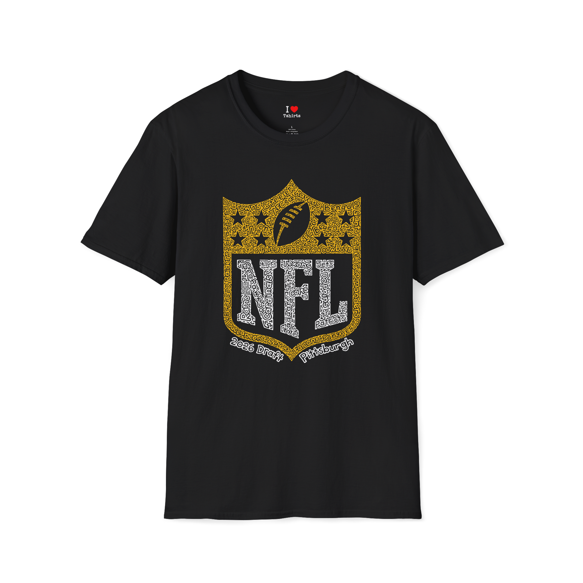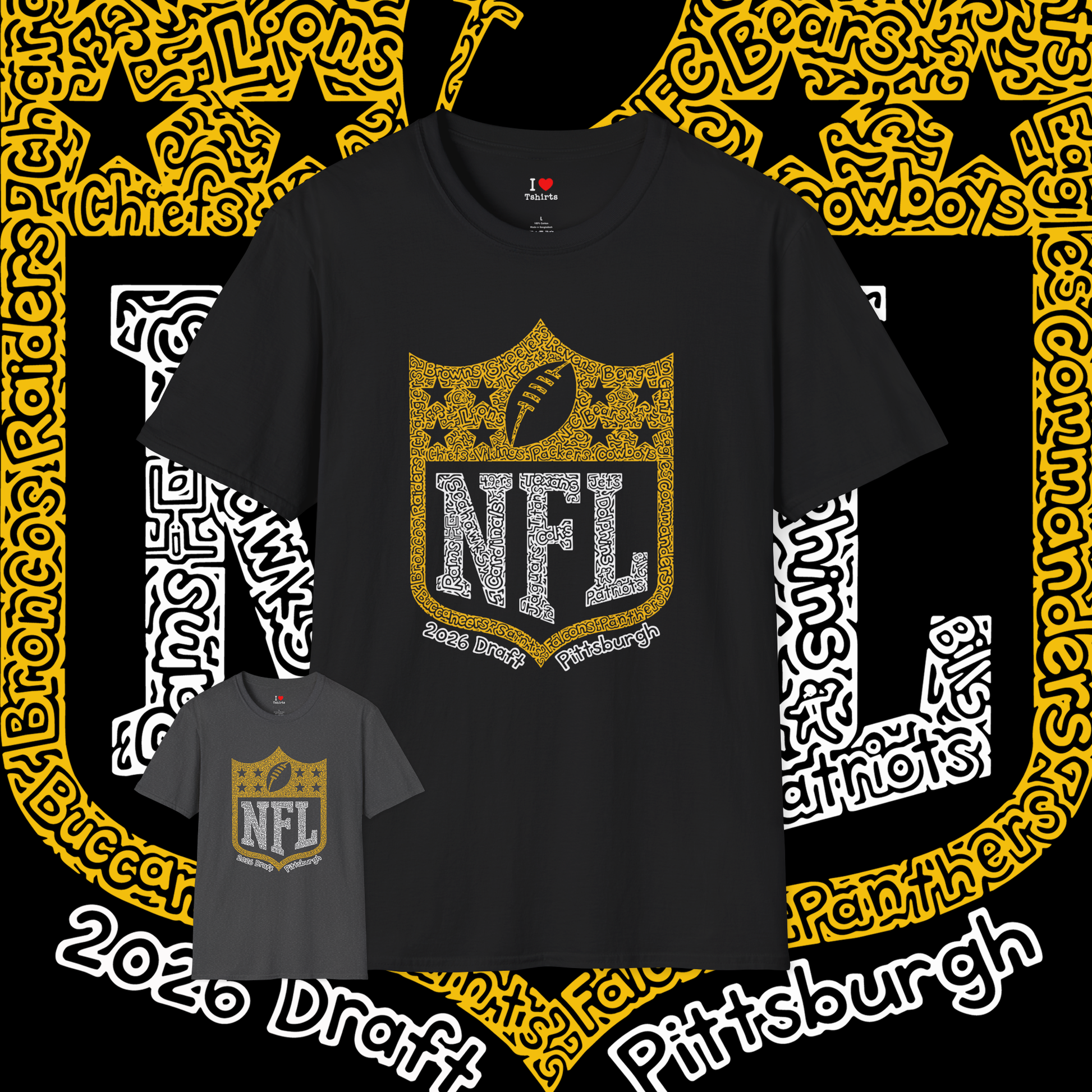 The NFL Draft is in Pittsburgh in 2026 and this is the perfect commemorative tshirt for the occasion! We altered my hidden wordart NFL drawing to a Pittsburgh themed colored design and drew the words "2026 Draft Pittsburgh" at the bottom.
