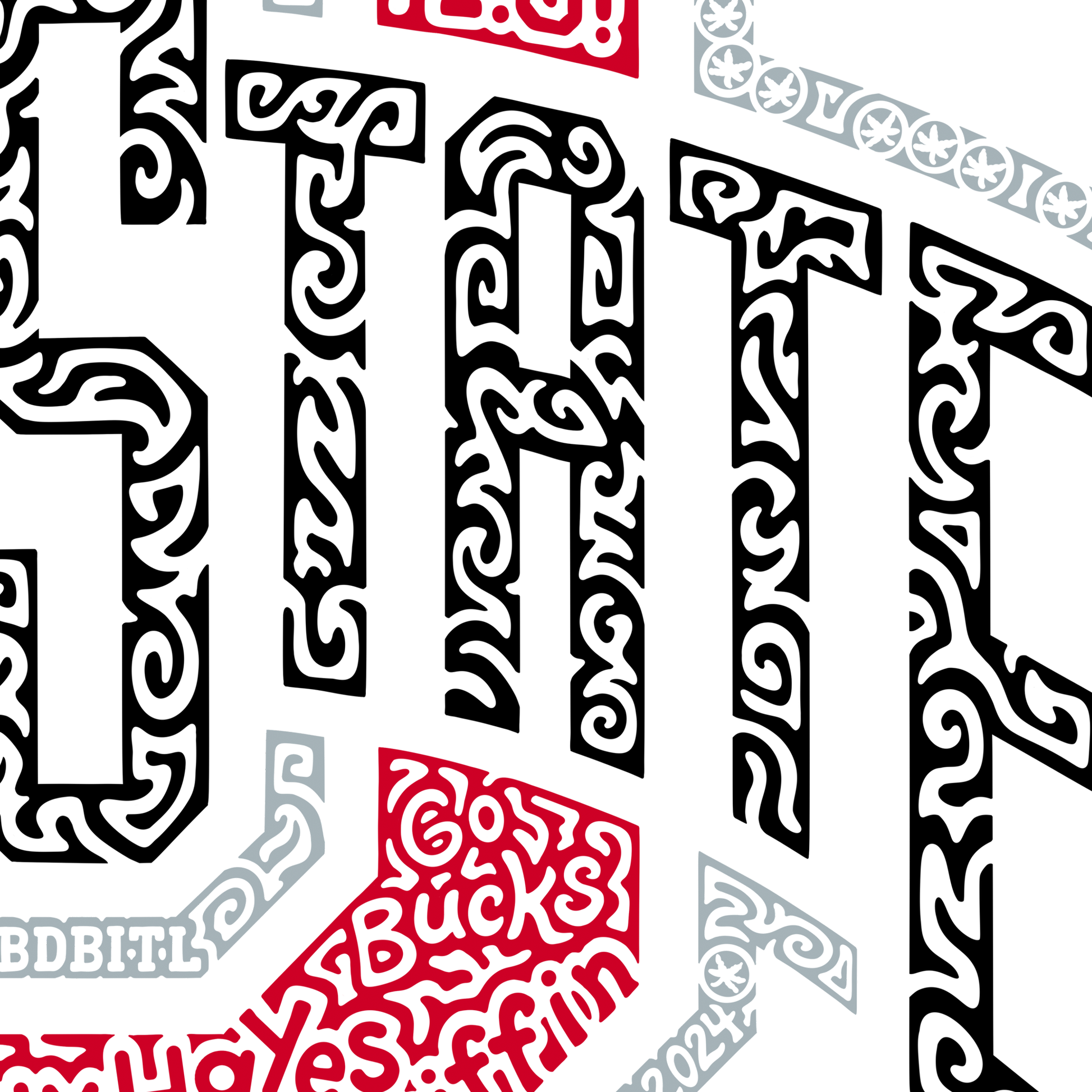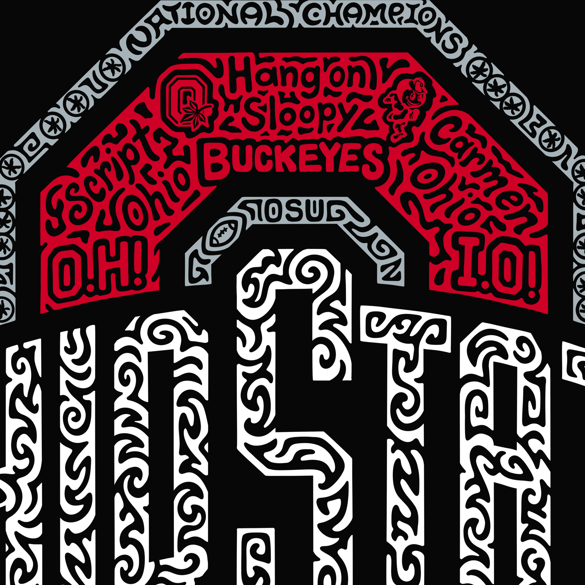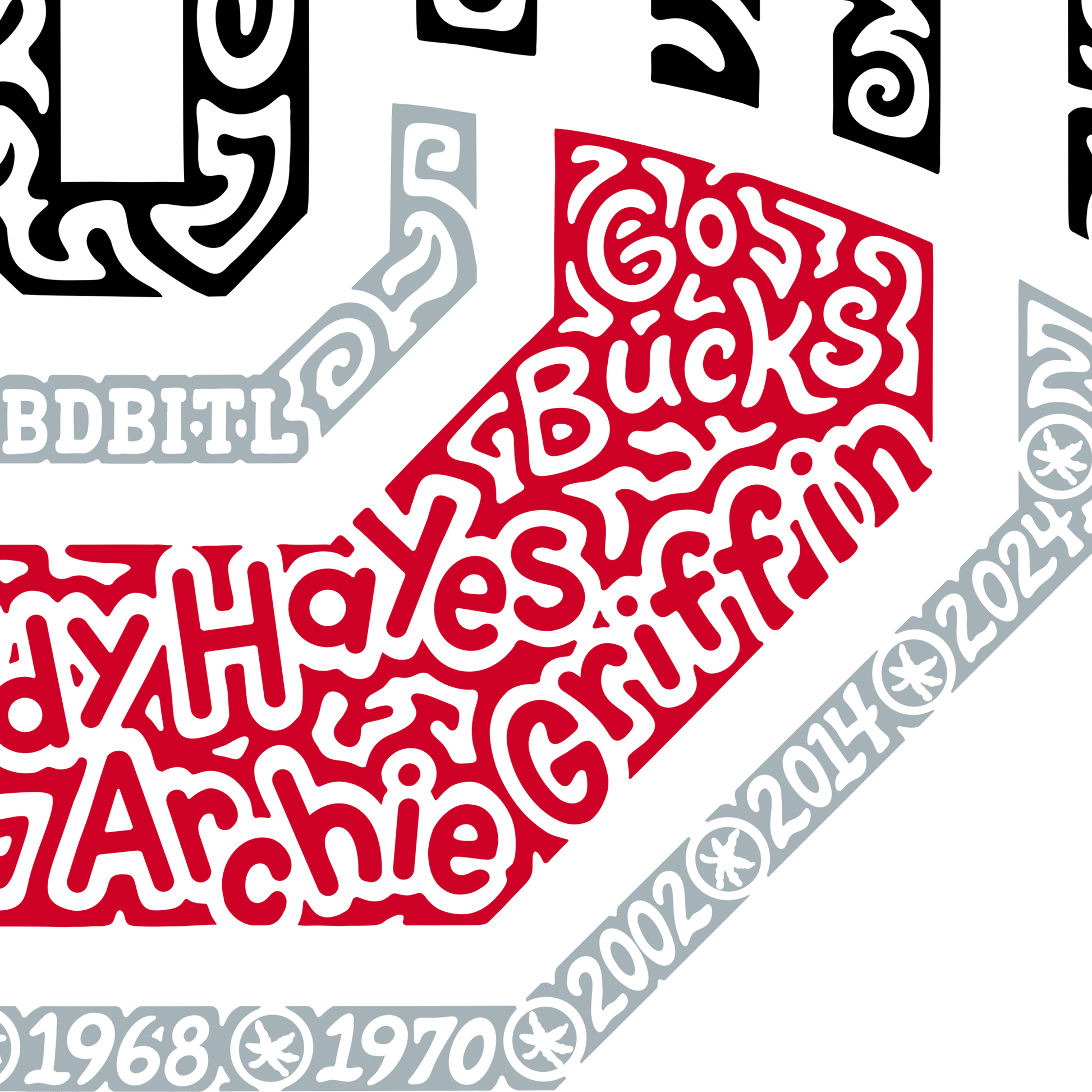 Words inside- O.H! I.O!, Script Ohio, Hang on Sloopy, Buckeyes, Carmen Ohio, The Shoe, Woody Hayes, Go Bucks, Eddie George, Archie Griffin, National Champions, OSU, TBDBITL