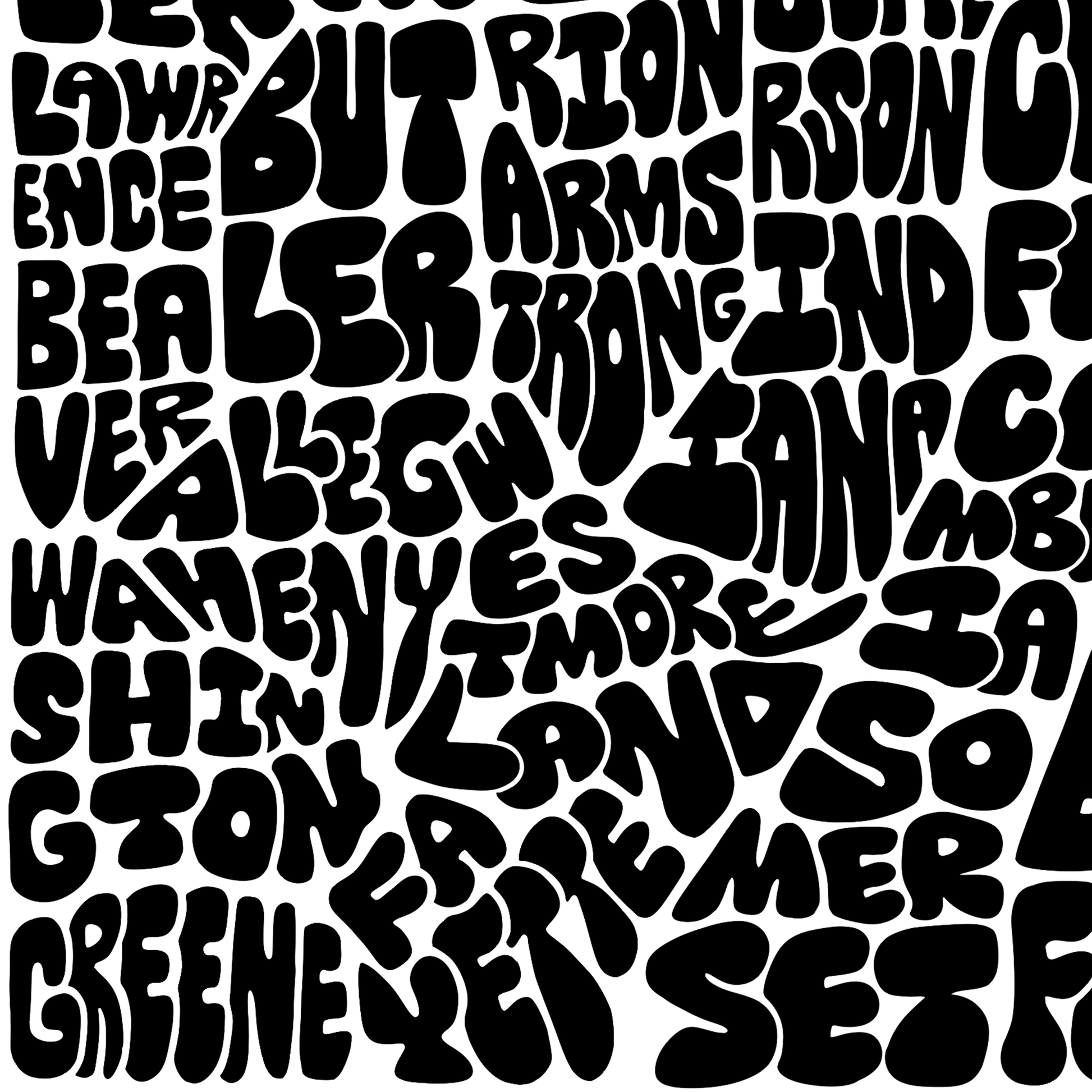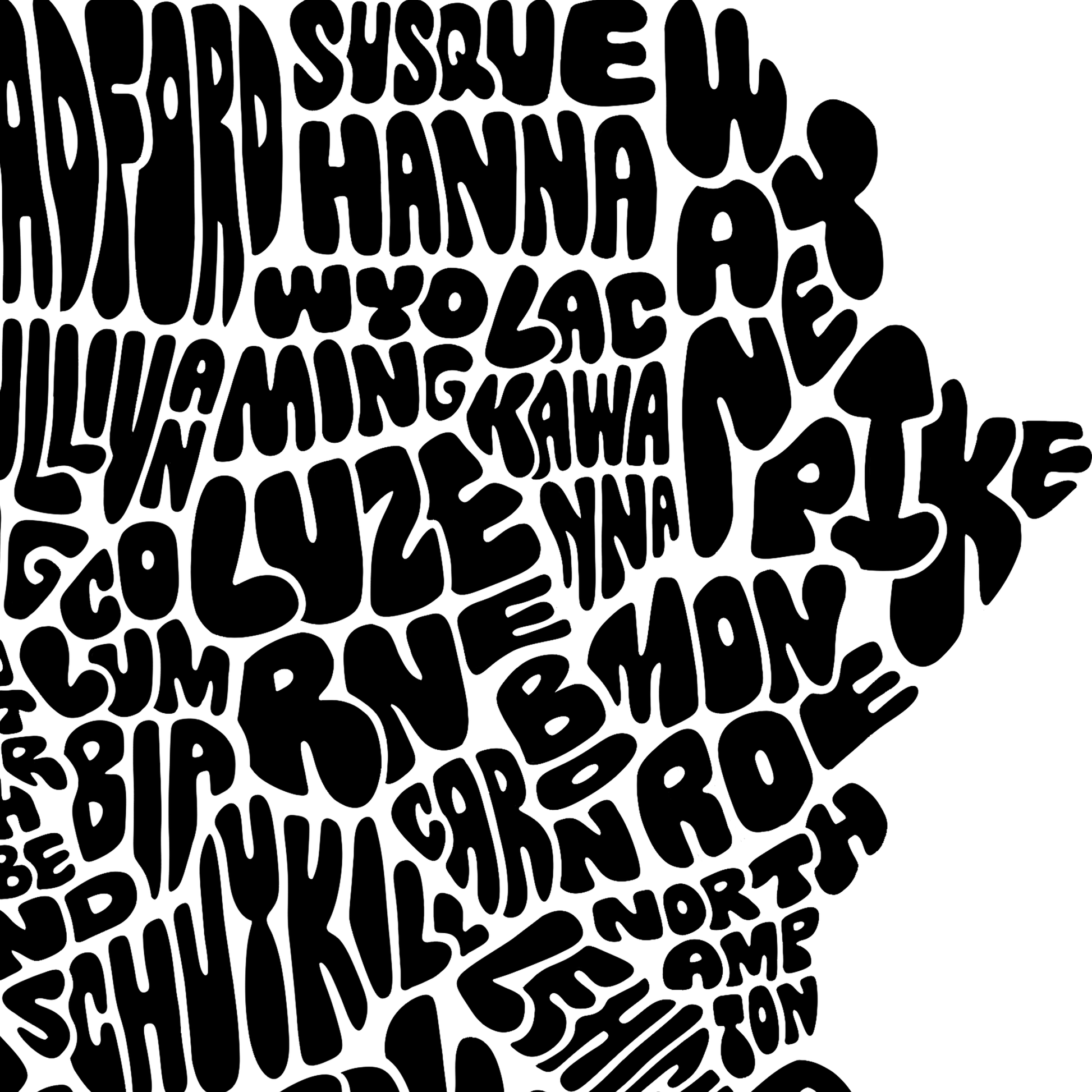 This version is the "letters only" instead of having any of the outline. I think it's really neat to see only the bubble letters form the shapes of the counties. Be sure to check out the color rendition of the "letters only" style. There is also a black and white version of the original outline of this drawing.