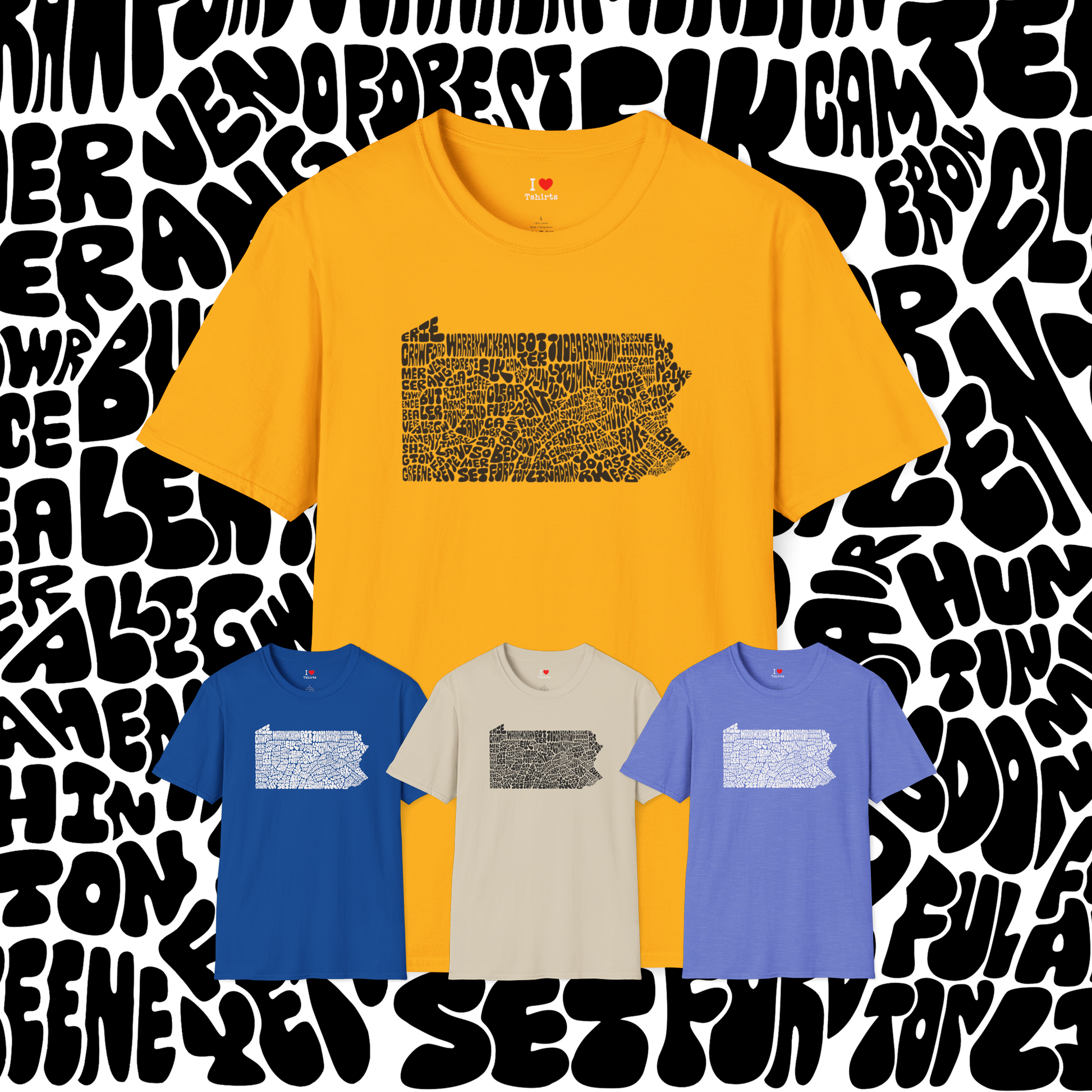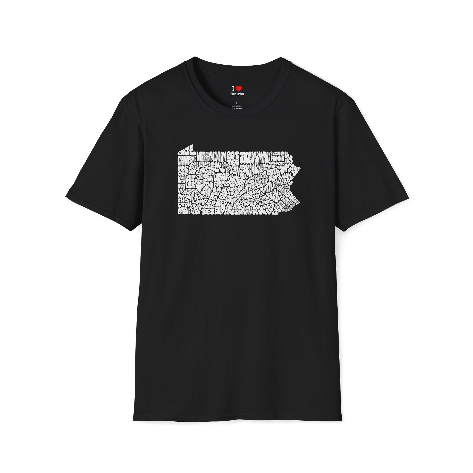 This unique Pennsylvania design was originally hand-drawn years ago and recently cleaned up digitally for tshirt printing. The shape of the state is created entirely from bubble-lettered county names, carefully arranged to form each county’s borders. With every county represented, it’s perfect for proud Pennsylvanians, history lovers, map enthusiasts, teachers, students, or anyone who appreciates hand-drawn art. Show your PA pride!