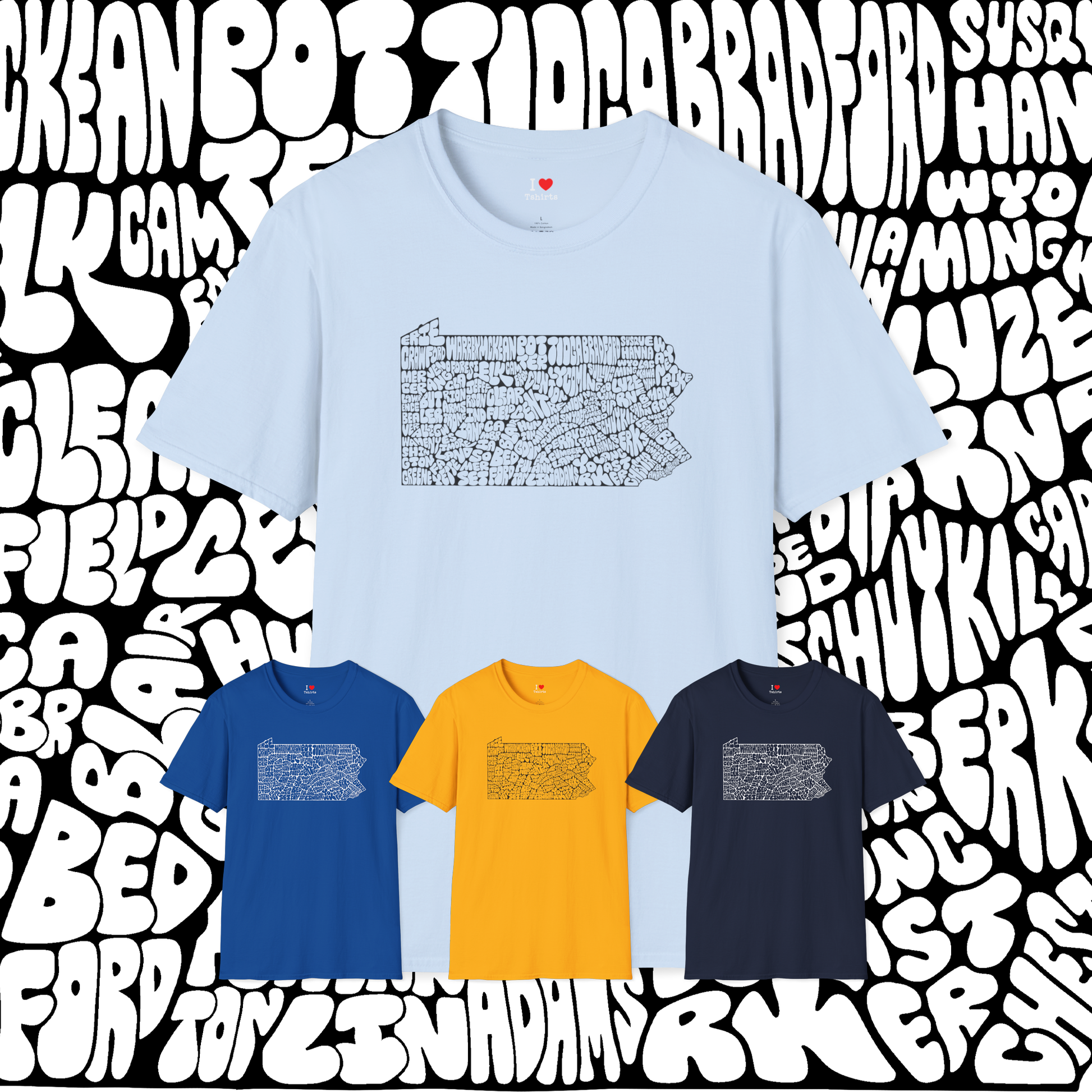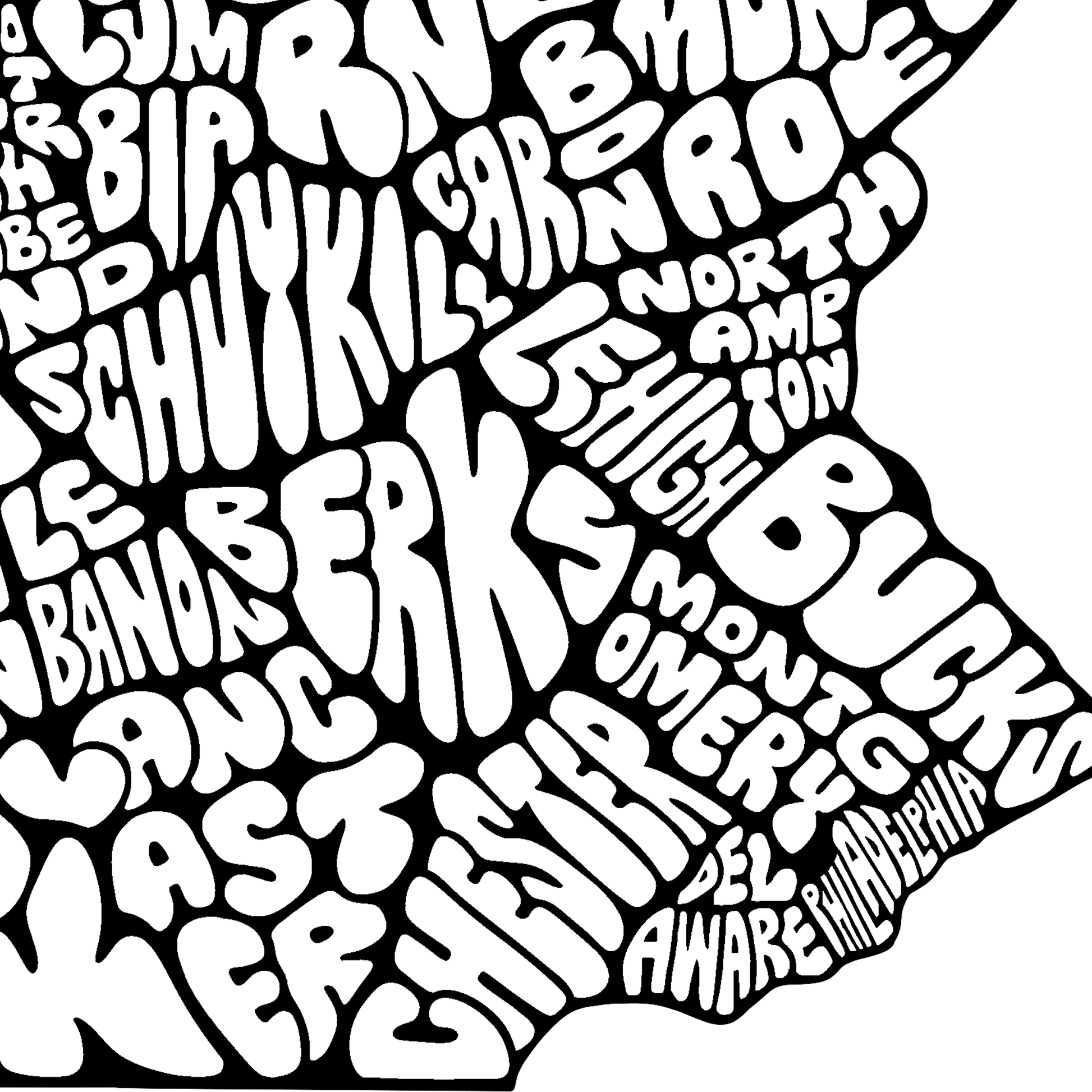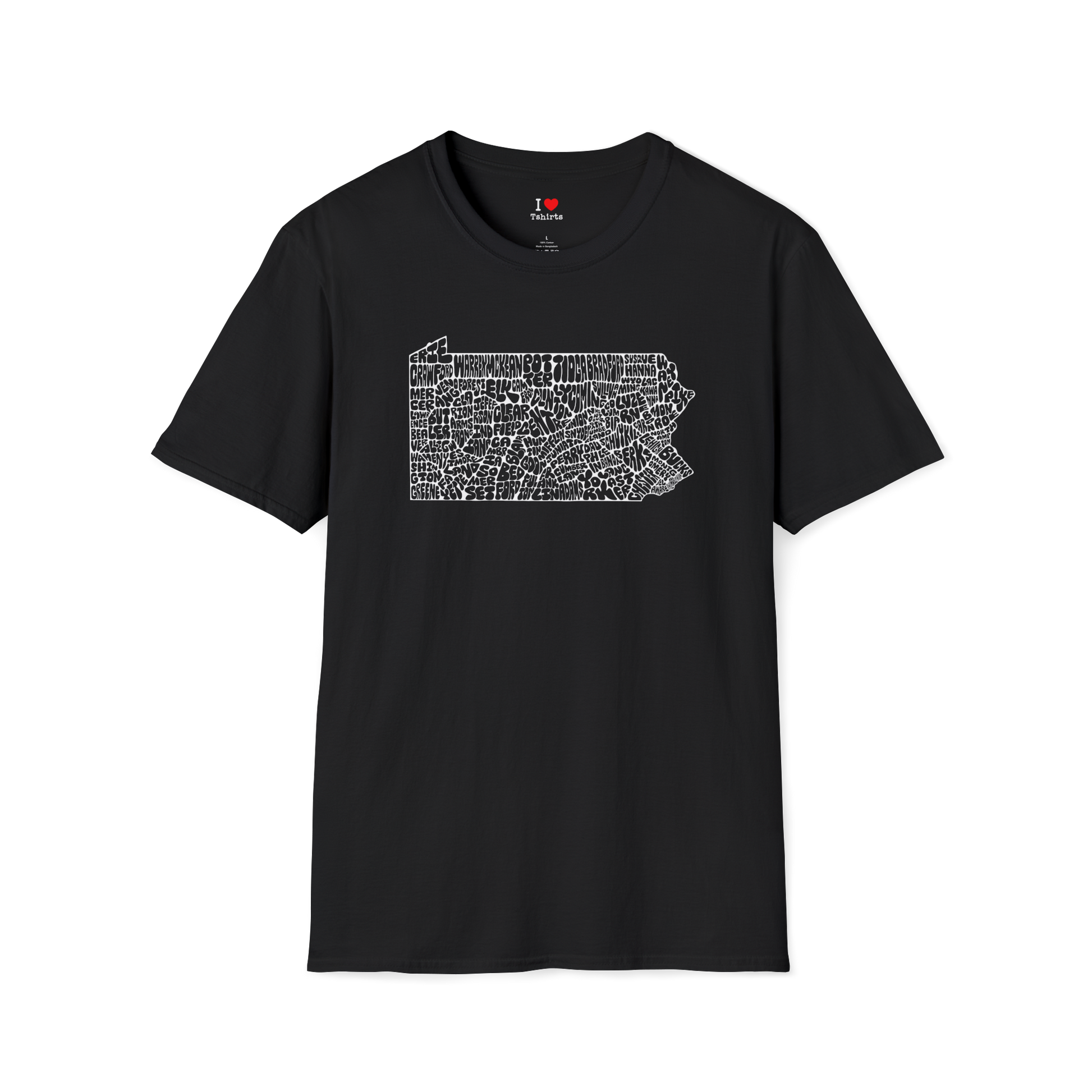 This unique Pennsylvania design was originally hand-drawn years ago and recently cleaned up digitally for tshirt printing. The shape of the state is created entirely from bubble-lettered county names, carefully arranged to form each county’s borders. With every county represented, it’s perfect for proud Pennsylvanians, history lovers, map enthusiasts, teachers, students, or anyone who appreciates hand-drawn art. Show your PA pride!