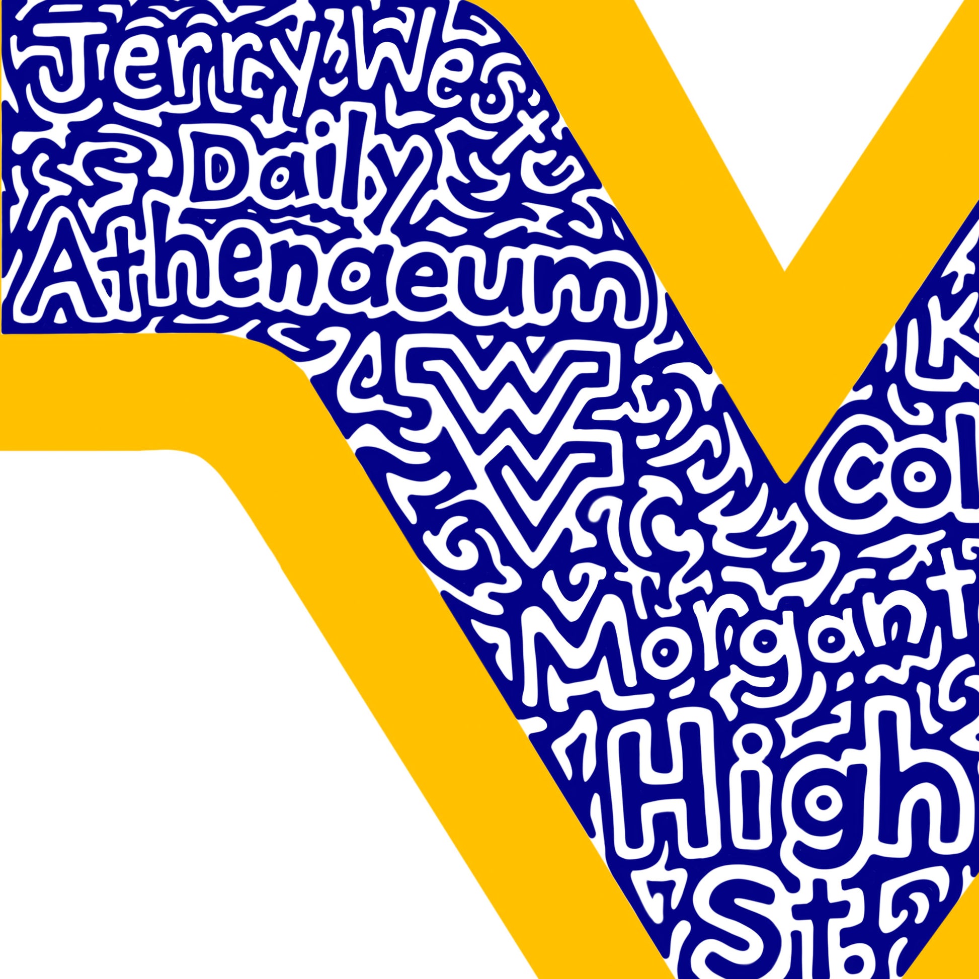 Words inside- Jerry West, Daily Athenaeum, Morgantown, High St, Coliseum, Don Knotts, Black Bear, Mountaineers, Evansdale, Mario's Fishbowl, Wise Library, Gold & Blue, Core Arboretum, Mountainlair, Woodburn Circle, PRT