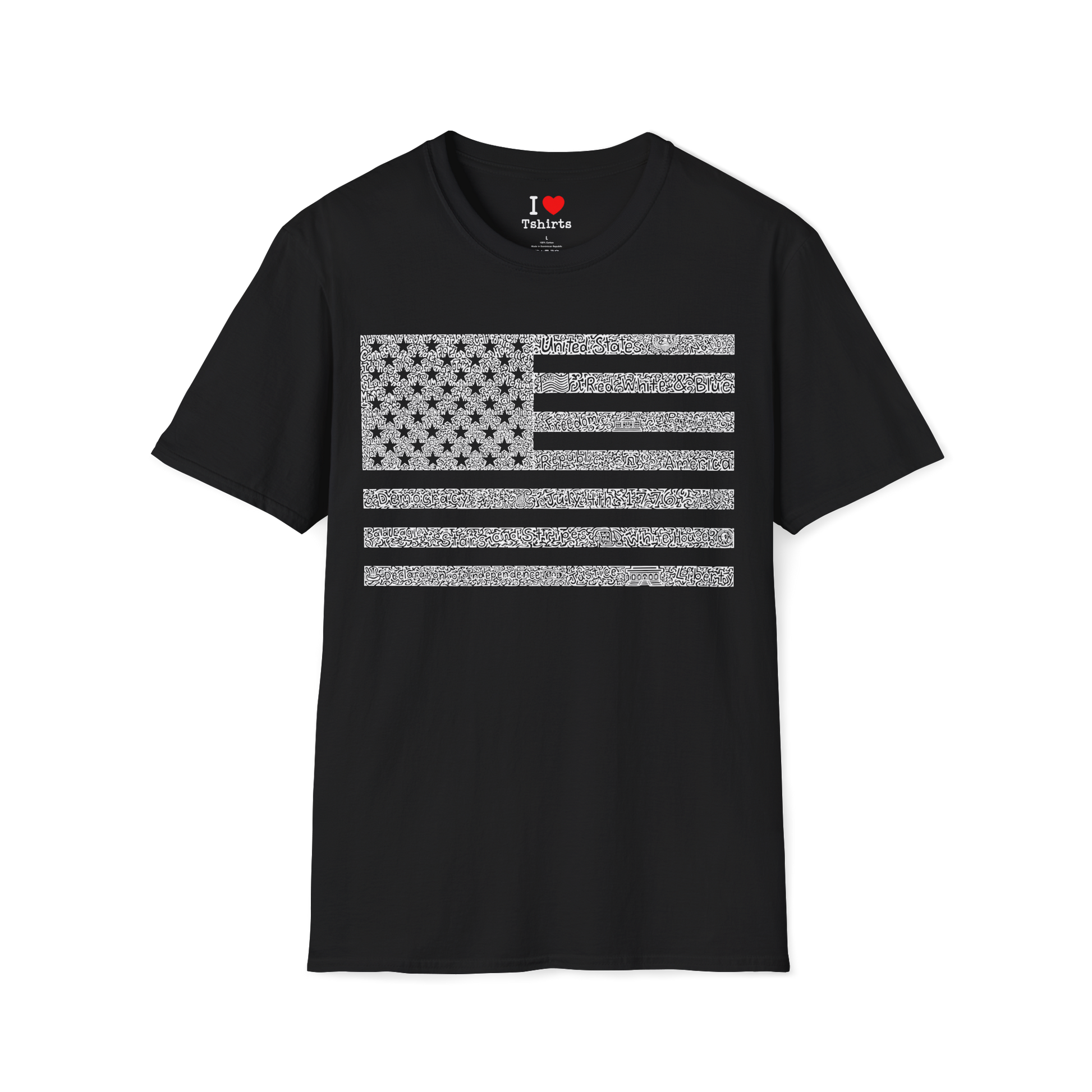 Pictures hidden inside: eagle, us flag with 13 stars, the white house, liberty bell, rattlesnake, statue of liberty, declaration of independence, a penny, uncle sam's top hat, one dollar bill, lincoln memorial